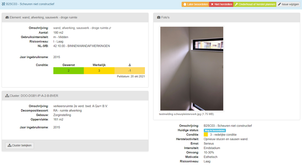 Wanneer een gebrek wordt geconstateerd, kan dit eenvoudig worden gekoppeld aan het betreffende element. Met de mogelijkheid om foto's toe te voegen en standaard NEN 2767-gebreken te koppelen, wordt de ernst, intensiteit en omvang van het gebrek ingevuld, en wordt de werkelijke NEN 2767-conditie berekend. De gebreken kunnen direct vanuit Qur+ worden doorgestuurd naar contractanten en worden opgelost. Door samen te werken in één systeem, krijgt u direct inzicht in de status en voortgang van de gebreken.